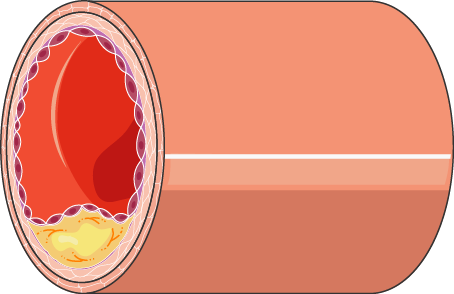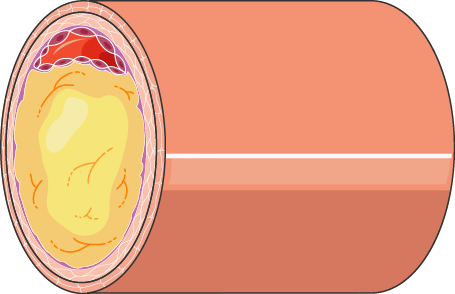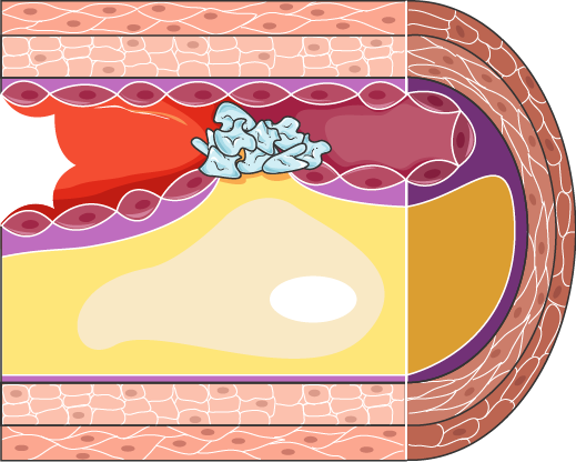 Suonen sisäseinän vaurioituneeseen kohtaan alkaa kertyä kolesterolista koostuvaa rasvaplakkia. Tätä vuosia tai vuosikymmeniä kestävää sairautta kutsutaan ateroskleroosiksi. Jos suonen sisätilaan pullistavan ateroomaplakin peittävä pinta repeää verivirtaan, muodostuu haavapinta, johon syntyy äkkiä suonen tukkiva verihyytymä ja seurauksena on sydäninfarkti.
